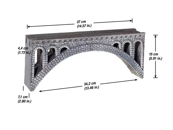Das Rhône-Viadukt ist ein eindrucksvolles Brücken-Fertigmodell mit einer Länge von 37 cm. Mit dem Viadukt lassen sich selbst große Täler elegant überspannen. Natürlich kann das Rhône- Viadukt ideal mit dem geraden oder mit dem gebogenen Bruchsteinviadukt kombiniert werden.