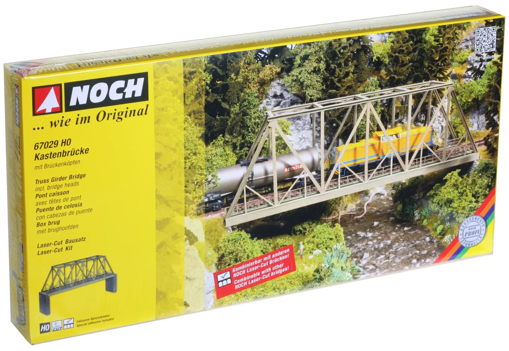 Brücken von NOCH steigern die Attraktivität jeder Modellbahnanlage. Sie sind zudem vielseitig einsetzbar, zum Beispiel zum Überwinden von Steigungen, Flüssen und Tälern. Die "Kastenbrücke " eignet sich ideal, um realgetreue Landschaftsszene noch individueller und detailgetreuer nachzugestalten. In verschiedenen Landschaftsszenarien lässt sich die "Kastenbrücke " perfekt einbringen. Die Modelleisenbahn bahnt sich ihren Weg über die stabile Brücke und überquert sicher Täler, Flüsse und Abhänge. Bringen Sie mit der "Kastenbrücke " einen echten Hingucker auf Ihr Diorama.
