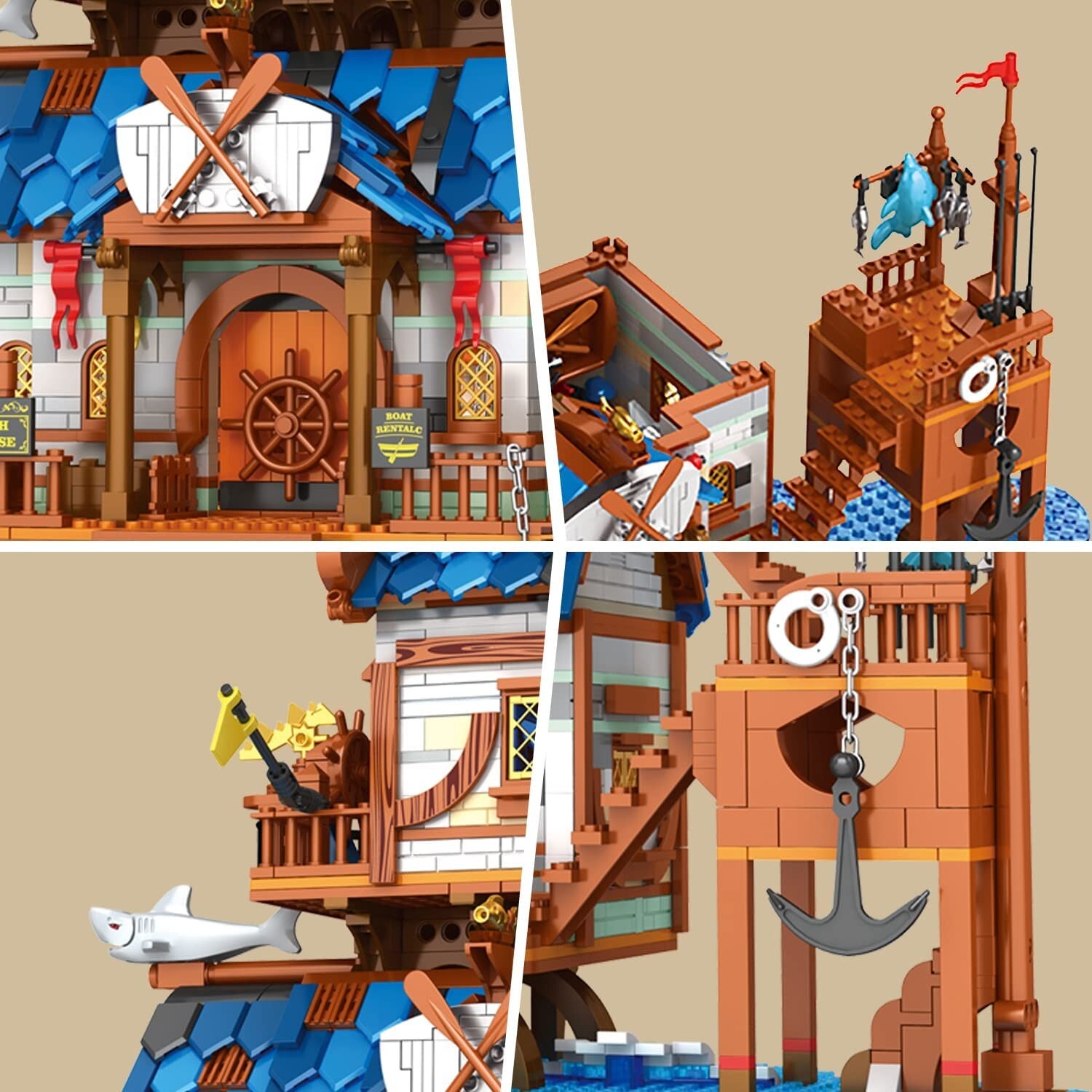 Lustiges Kreatives Zubehör:Fischerboote für Fischer, verschiedene abnehmbare Angelwerkzeuge, Wale/Haie in der Tiefsee usw. Diese maritimen Accessoires verleihen diesem Fischerhaus eine kreative und interessante Farbe und machen dieses Bauset auch voller Spielbarkeit.
