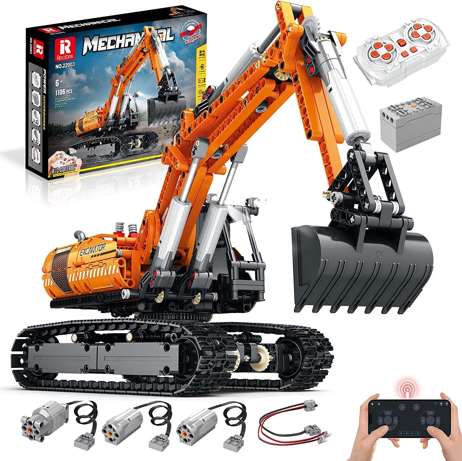 Power Funktionsmotor: 1x 2,4-G-Fernbedienung, 1x Lithiumbatterie, 1x L-Motor, 2x M-Motor, 1x LED-Lichtlinie, verwenden Sie die Fernbedienung oder die mobile APP, um das Fahrzeug zu steuern, erkunden Sie die echte Kabine und das Bedienfeld und Erleben Sie den Bagger-Workflow.