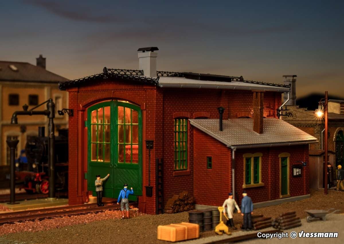 Bei diesem Lokschuppen können Sie den Fahrdraht Ihrer Oberleitung bis in den Lokschuppen hinein führen. Maße: L 17 x B 12 x H 11 cm.