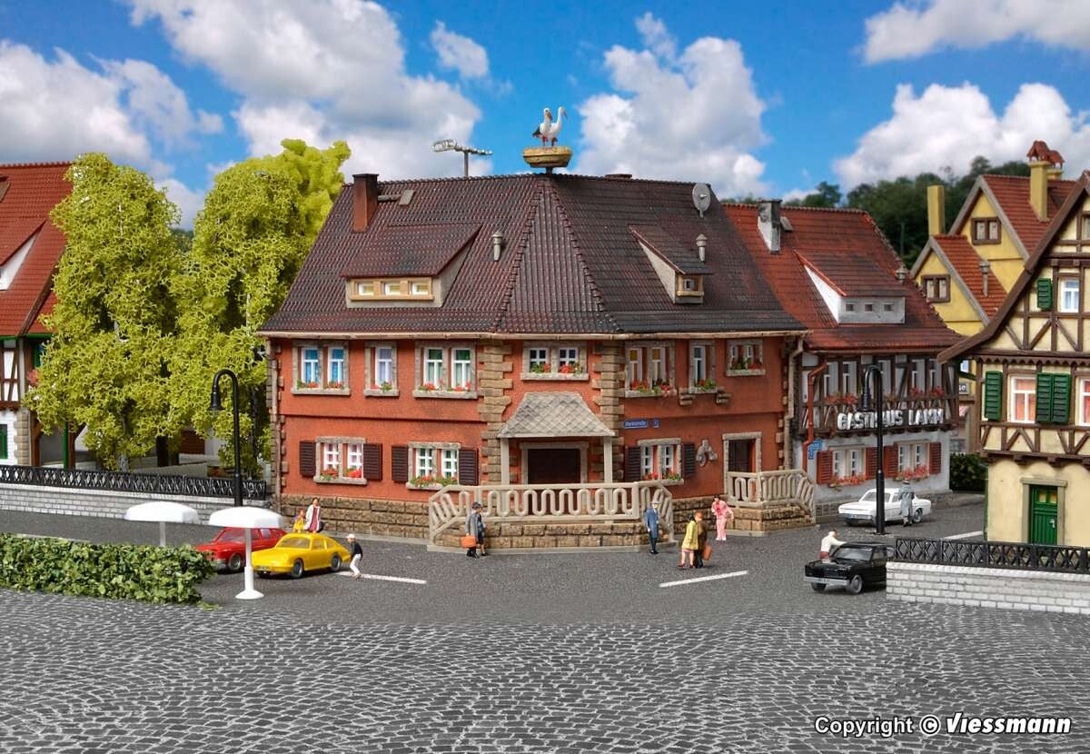Mit den Bausätzen der Vollmer Marktstraße 2 – 6 können Sie einen kompletten Straßenzug mit Wohn-, Geschäfts- und Fachwerkhäusern gestalten. Bereits mit 3 Bausätzen schaffen Sie sich eine preiswerte und abwechslungsreiche Häuserfront. An diesem Eckhaus fällt besonders der überdachte Treppenaufgang mit dem filigranen Geländer ins Auge. Ein besonderes Detail ist das Storchennest auf dem Dach. Maße: L 10,2 x B 10,2 x H 10,5 cm.
